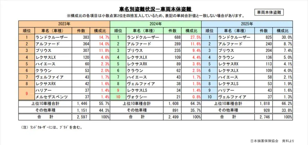 盗難リスクの高い車種と言えば「ランドクルーザー」や「アルファード/ヴェルファイア」をイメージする方が多いと思いますが、ハイエースは過去にはベスト3に入ることも多く、直近においても必ず10番以内に入る非常に盗難被害の多い車両となっています。