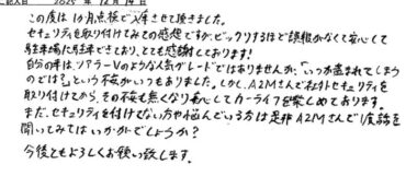 自分の車は、ツアラーVのような人気グレードではありませんが、「いつか盗まれてしまうのでは?」という不安がいつもありました。しかし、A2Mさんで社外セキュリティを取り付けてから、その不安も無くなり安心してカーライフを楽しめております。
