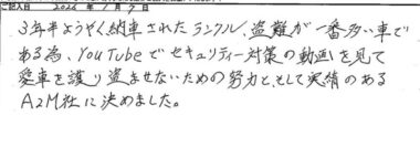 3年半ようやく納車されたランクル、盗難が一番多い車である為、YouTubeでセキュリティ対策の動画を見て愛車を護り盗ませないための努力と、そして実績のあるA2M 社に決めました。