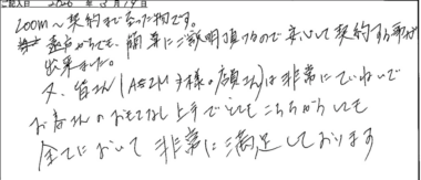 ZOOM〜契約まで至ったものです。遠方からでも、簡単にご説明頂けるので安心して契約する事が出来ました。