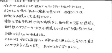 接客は完全予約制で待ち時間なし、取付前の丁寧な説明と、取付後のアフターサービスも徹底しているので心配することなく、お願いすることができました。これからは今までの盗難への不安が全く無くなって、安心して乗ることが出来ると思います。