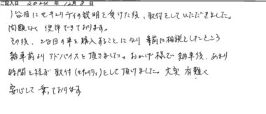 その後、2台目の車を購入することになり、事前に相談をしたところ納車前よりアドバイスを頂きました。おかげ様で納車後、あまり時間を経ず取付(セキュリティ)をして頂けました。大変有難く安心して乗っております。