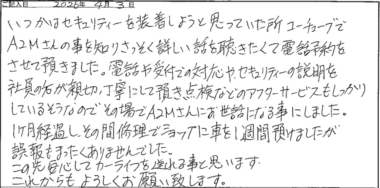 いつかはセキュリティーを装着しようと思っていた所、ユーチューブでA2Mさんの事を知りさっそく詳しい話を聴きたくて電話予約をさせて頂きました。電話や受付での対応やセキュリティーの説明を社員の方が親切、丁寧にして頂き点検などのアフターサービスもしっかりしているそうなのでその場でA2Mさんにお世話になる事にしました。1ヶ月経過し、その間修理でショップに車を1週間預けましたが誤報もまったくありませんでした。この先安心してカーライフを送れる事と思います。これからもよろしくお願い致します。
