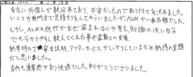 しかし、A2Mの施行がなぜ盗まれないか等を、知識の浅い自分でも分かりやすく教えてくれた事や盗難0の実績、納車時丁寧な説明、アフターサービスがしっかりしているため納得の金額だと思いました。店内も清潔感があり快適でした。ありがとうございました。