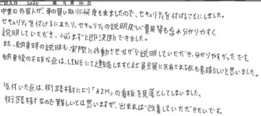 セキュリティを付けるにあたり、セキュリティの説明及び費用等も含め分かりやすく説明していただき、悩まずに即決断できました。