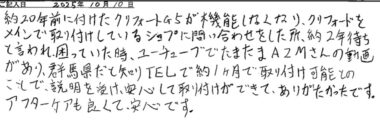 約20年前につけたクリフォードG5が機能しなくなり、クリフォードをメインで取り付けしているショップに問い合わせをした所、約2年待ちと言われ、困っていた時、ユーチューブでたまたまA2Mさんの動画があり、群馬県だと知りTELで約1ヶ月で取り付けができて、ありがたかったです。