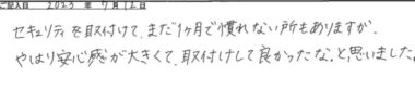 セキュリティ取付けて、まだ1か月で慣れない所もありますが、やはり安心感が大きくて、取付けしてよかったなと思いました。